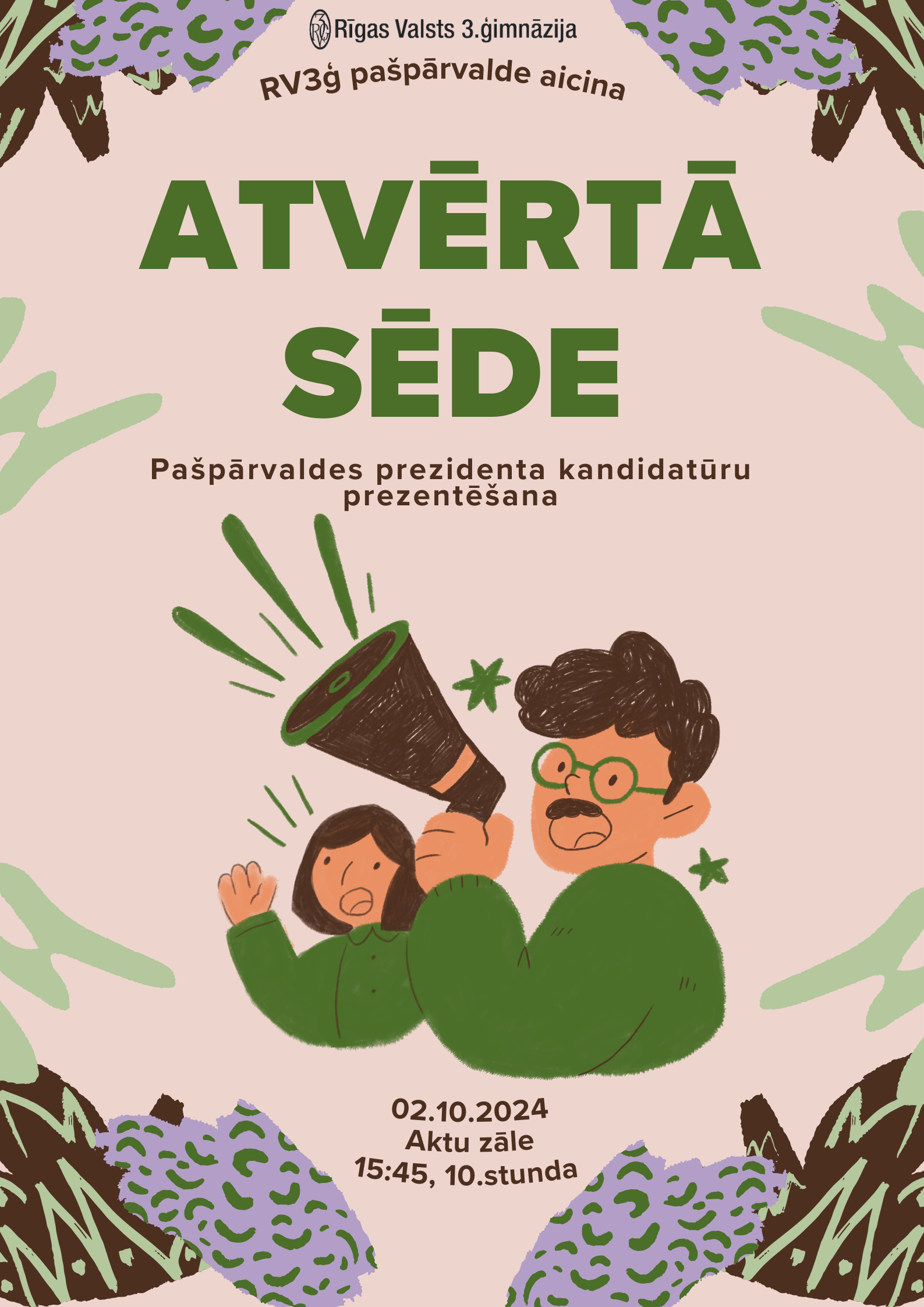 2024. gada 2. oktobrī Rīgas Valsts 3. ģimnāzijas paplašinātajā skolēnu pašpārvaldes sanāksmē prezidenta amata kandidāti Augusts Putniņš, Aleksandrs Šmits, Katrīna Kalnbērza un Enija Dārziņa iepazīstināja ar sevi un vīziju skolas dzīves un Skolēnu pašpārvaldes attīstībai un pilnveidei.